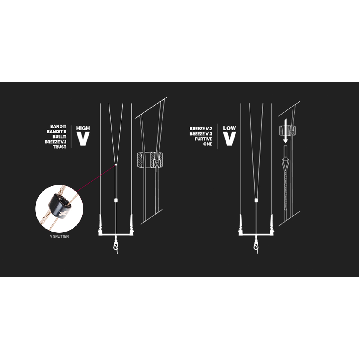 Wechsel zwischen hohem V (für BANDIT, BANDIT S, BULLIT) und niedrigem V (für FURTIVE, BREEZE, ONE) möglich.