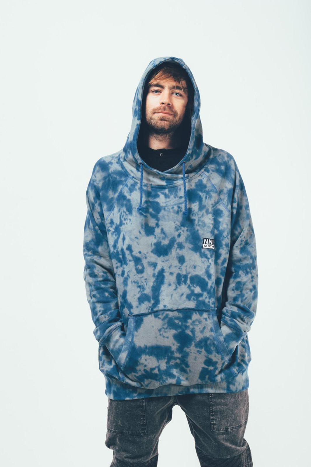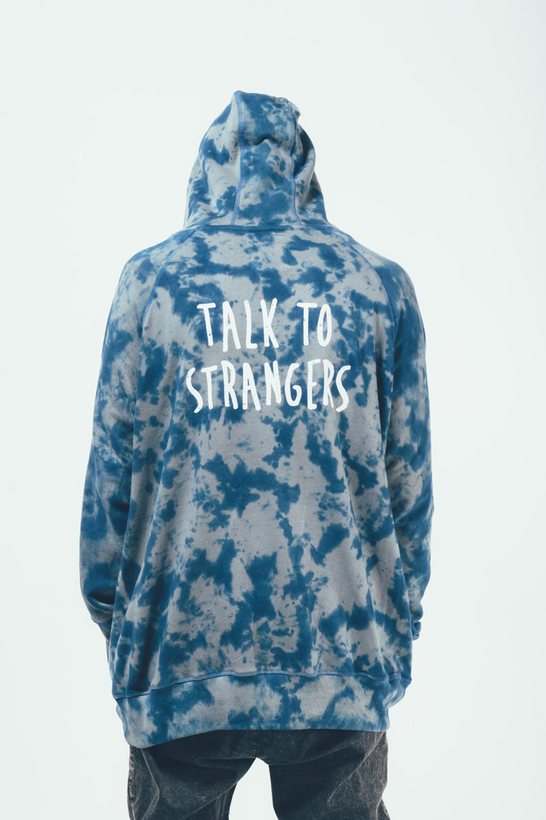 Der Dauntless Chat bietet neben einem atemberaubenden Icy-Tie-Dye-Allover und seinem klassischen Hoodie-Schnitt einen großen Talk to Stranges Backprint.